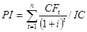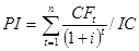 Индекс доходности (Profitability index, PI) показывает относительную прибыльность проекта, или дисконтированную стоимость денежных поступлений от проекта в расчете на единицу вложений. Формула расчета индекса доходности: