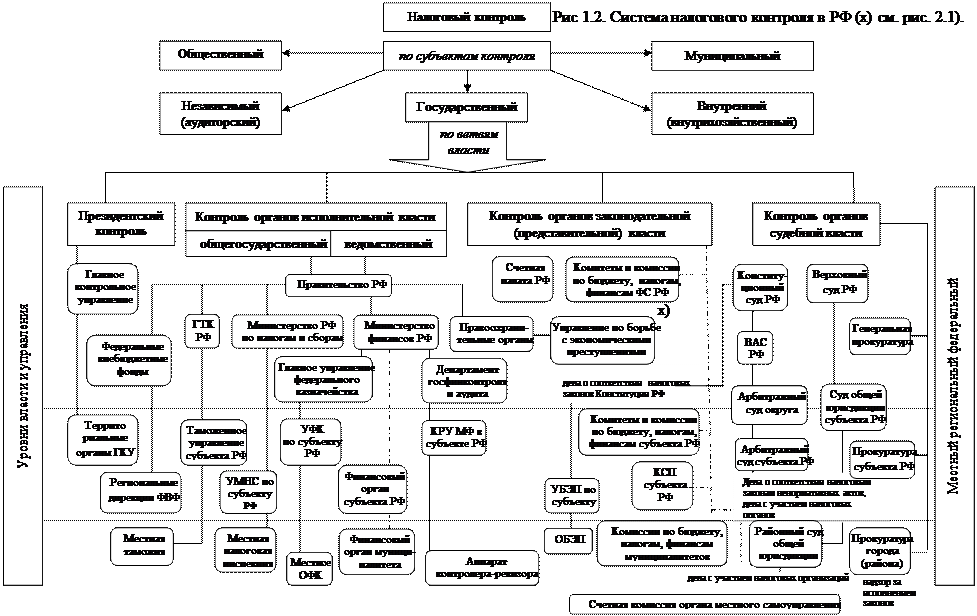 Система налогового контроля, существующая в России, очень сложна и потому сложно добиться согласованной работы всех ее звеньев и надлежащего выполнения ими своих задач. О сложности системы свидетельствует схема, приведенная на рис. 1.2. Рассмотрим ее.
