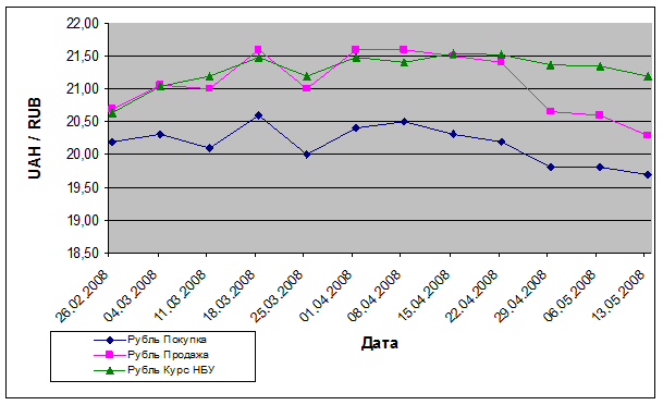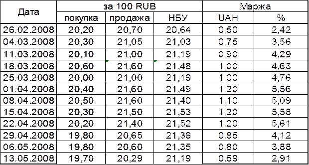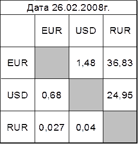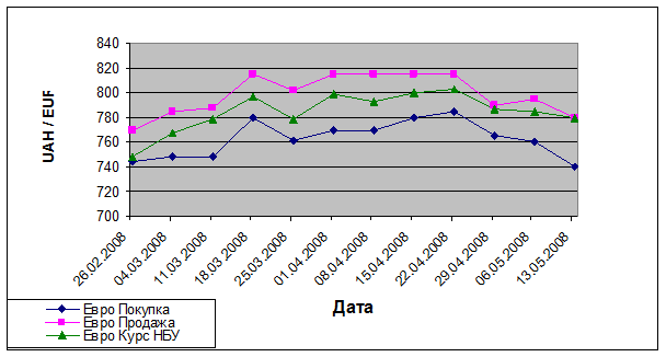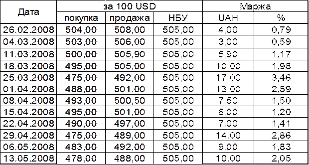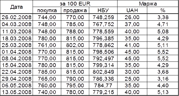 Дата 26.02.2008 г. ------------------ 13.05.2008 г. | Покупка 744,00 --------------------- 740,00 | Продажа 770,00 ---------------------- 780,00 |