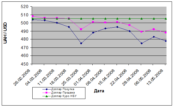 Проследила каждые двенадцать недель, начиная с 26 февраля 2008 года, выбрав день – вторник, наличные обменные курсы (евро EUR, доллары США USD, российские рубли RUR, гривни UAH), и валютный курс Национального банка Украины. Банк – АКБ «Меркурий»
