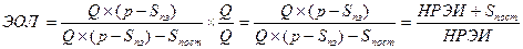 Например: Допустим в отчетном году выручка от реализации составила 10 млн.руб. при совокупных переменных затратах 8.3 млн.руб. и постоянных затратах 1.5 млн.руб. Прибыль = 0.2 млн.руб.