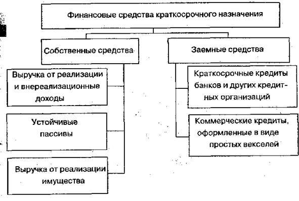 Финансовые средства краткосрочного назначения также могут быть как собственными, так и заемными. Собственные средства коммерческого предприятия для покрытия краткосрочных потребностей составляют выручка от реализации и внереализационные доходы, устойчивые пассивы, выручка от реализации имущества (рис. 3).