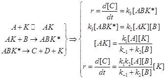 Общая кинетическая схема гомогенного катализа. (см. книгу Ерёмина)
