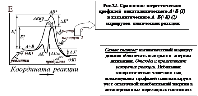 Энергетические профили некаталитического (1) и каталитического (2) маршрутов химической реакции совмещены на рисунке. Верхняя кривая отвечает некаталитическому протеканию процесса, нижняя с двумя максимумами соответствует механизму реакции в присутствие катализатора (на самом деле вдоль оси ординат обе кривые раздвинуты на величину энергии катализатора).