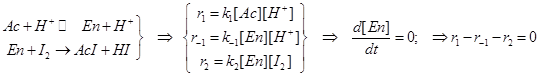 Каталитический активированный комплекс типа Вант-Гоффа (протонированный енол) Реакция йодирования ацетона (см. Ерёмин, стр.307)