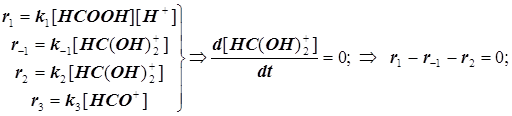 При одновременном действии многих катализаторов (пункт 6) как и при образовании многих промежуточных продуктов из одного катализатора (пункт 9) результирующая скорость реакции равна сумме скоростей реакции разложения отдельных промежуточных продуктов.
