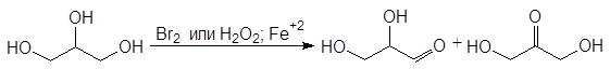 Как и этиленгликоль, глицерин при окислении может давать большое число различных продуктов. При взаимодействии глицерина с бромной водой или реагентом Фентона получается смесь глицеринового альдегида (2,3-дигидроксипропаналя) и 1,3-дигидроксиацетона (1,3-дигидрокси-2-пропанона)