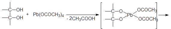 Тетраацетат свинца окисляет диолы точно так же. Доказано, что атомы кислорода в полученных карбонильных соединениях не содержались в тетраацетате свинца. Приведем один из возможных механизмов: