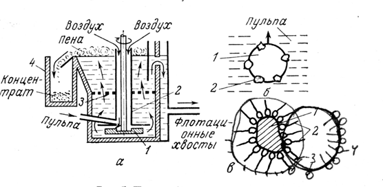 3 — решётка; 4 — жёлоб для концентрата; б — флотация не смачиваемых водой гидрофобных частиц в пузырьке воздуха: 1 — пузырёк воздуха; 2 — частицы;