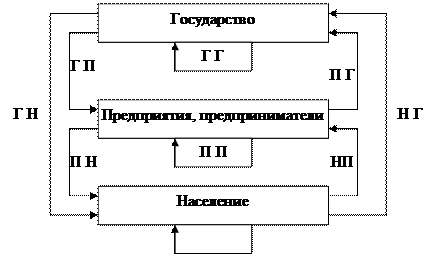 За каждой из указанной на схеме стрелок стоит множество разнообразных финансовых связей, потоков, отношений. Основываясь на общей схеме финансовых потоков между экономическими агентами, рассмотрим отдельные, наиболее представительные связи и финансовые отношения на разных уровнях. К ним относятся: “государство-предприятие” (ГП), “предприятие-государство” (ПГ), “государство-государство” (ГГ), “предприятие-население” (ПН), “население-государство” (НГ), “население-предприятие” (НП), “предприятие-предприятие” (ПП), “население-население” (НН), “государство-население” (ГН). Связь “государство-государство” характеризует перераспределение, переток денежных средств из одних каналов государственного бюджета в другие. Связь “предприятие-предприятие” отражает финансовые потоки между предприятиями, а связь “население-население” определяет движение денежных средств между отдельными группами населения.