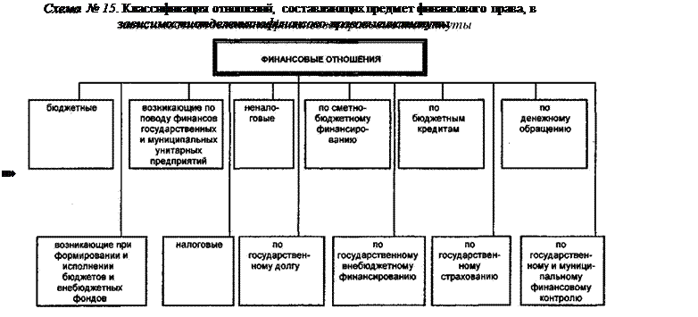Схема № 15. Классификация отношений, составляющих предмет финансового права, в зависимости отделения на финансово-правовые