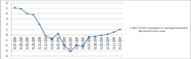 В период кризиса у банка упал темп прироста по кредитам, выдаваемым физическим лицам, т.е. если в докризисный период он стабильно находился в пределах 4-5 %, то с середины ноября 2008 года он стал отрицательным [27]. И лишь к концу 2009 года банку удалось снова установить положительный темп прироста (рис. 6).
