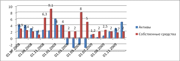 — Кризис ликвидности, ставший следствием кризиса доверия. Большой отток ликвидных активов привел к тому, что банкам пришлось наращивать долю собственных средств. Т.е. раньше темп прироста активов был выше темпа прироста собственных средств, но т.к. клиенты изымали вклады, то банк лишался активов, следовательно пришлось возмещать недостачу за счет собственных средств (рис. 7).
