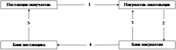 Рис.1. Схема документооборота при расчетах платежными поручениями (1 — отгрузка продукции, оказание услуг, выполнение работ; 2 — предъявление в банк платежного поручения на перечисление средств поставщику; 3 — выписка с расчетного счета о списании суммы со счета плательщика; 4 — направление платежного поручения из банка плательщика в учреждение банка, обслуживающее получателя; 5- выписка с расчетного счета поставщика о зачислении суммы).
