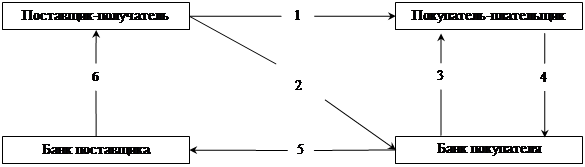 Рис. 2. Схема документооборота при расчетах платежными требованиями-поручениями (1 — отгрузка продукции, выполнение работ, оказание услуг; 2 — выписка комплекта платежных требований-поручений и пересылка его вместе с отгрузочными документами в банк плательщика; 3 — передача банком-плательщиком полученных документов для акцепта покупателя; 4 — возврат платежных требований-поручений с акцептом; 5 — направление документов из банка плательщика в учреждение банка, обслуживающего получателя; 6 — выписка с расчетного счета получателя о зачислении суммы.
