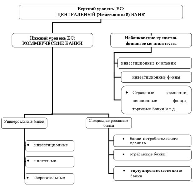 Разделением целей и функций между ЦБ РФ и другими кредитными организациями определяется двухуровневый характер организации банковской системы России. Центральный банк Российской Федерации составляет верхний её уровень и находится в федеральной (государственной) собственности. Нижнее звено данной системы представляют коммерческие банки и небанковские организации.