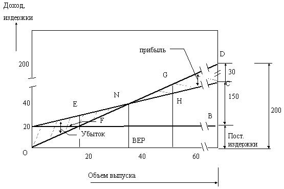 Проекция точки N на ось абсцисс дает критический объем производства в физических единицах измерения (шт. м, кг). Проекция точки N на ось ординат дает критический объем производства в стоимостном измерении.
