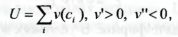 где с, — потребление индивидуального товара г, а суммирование осуществляется по всему имеющемуся в экономике спектру товаров. Предположение о вогнутости функции полезности принципиально, так как это обеспечивает свойство потребительского спроса, именуемое любовью к разнообразию: при равенстве цен потребитель скорее предпочтет разделить свой доход между всеми имеющимися в ассортименте товарами, нежели сконцентрироваться лишь на нескольких. Тем самым одно только увеличение ассортимента товаров, при прочих равных, обеспечит ему рост полезности.