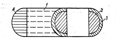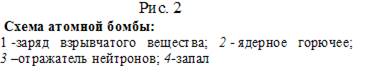 энергия достигнет взрывного порога. Это может быть обеспечено при определенной массе делящегося вещества. Минимальную массу этого вещества, необходимую для взрыва, называют критической. Однако, если два куска делящегося материала, которые в сумме составляют критическую массу, находятся на каком-то расстоянии друг от друга, то взрыва не происходит. Достаточно соединить эти куски и произойдет взрыв. После сказанного будет понятен принцип устройства атомной бомбы (рис. 2): запал 4 обеспечивает взрыв обычного взрывчатого вещества 1, это приводит в соприкосновение куски ядерного горючего 2, которые вместе составляют критическую массу, и происходит взрыв.