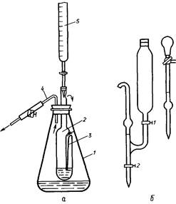 Проводят титрование медно-щелочного раствора с известным титром исследуемым раствором сахара без доступа воздуха в токе водяного пара. Титр медно-щелочного раствора устанавливают по глюкозе. Прибор для титрования состоит из внешнего сосуда — конической колбы / и внутреннего сосуда — эбулиостата 1 с впаянной в его боковую стенку трубкой, доходящей почти до дна сосуда. Суженный конец эбулиостата вставлен в колбу / на резиновой пробке и имеет отверстие для выхода пара 3. В резиновую пробку вставлена стеклянная трубка 4 для отвода избытка пара из колбы /. Струю пара регулируют винтовым зажимом на резиновой трубке, надетой на конец стеклянной трубки. Во время титрования верхний конец эбулиостата закрывают резиновой пробкой, в которую вставлен конец бюретки 5 для раствора сахара. Реагирующая жидкость в эбулиостате обогревается паровой рубашкой и пропусканием пара через жидкость.