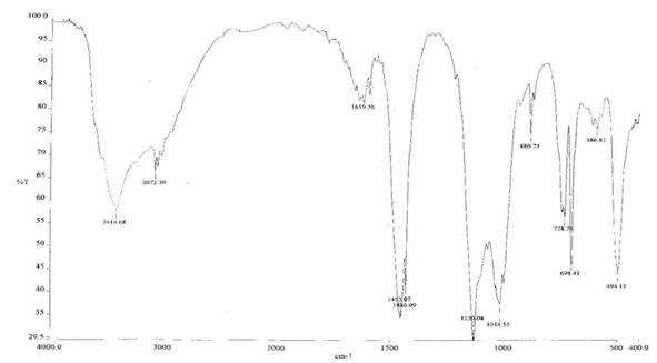 Синтез осуществлен в условиях аналогичных для синтеза мононатровой соли фенилсилантриола в водно-ацетоновой среде. Исходный поликобальтфенилсилоксан был синтезирован по раннее описанной методике в присутствии диметилсульфоксида.[20] В результате синтеза наряду с полимерными продуктами были выделены белое кристаллическое вещество, состав которого отвечает финилсилантриоляту натрия: PhSi(ONa)3 × 6,5H2 O, ИК-спектр представлен на рисунке 1.