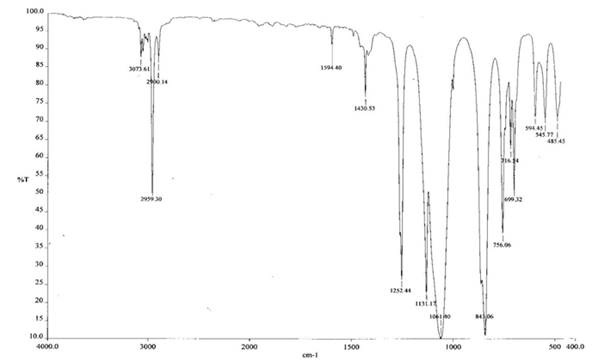 Спектр имеет простую колебательную структуру. В области 1000 – 1100 см-1 имеется только один максимум поглощения при 1061 см-1 отвечающий колебаниям связи Si-O, максимум при 1131 см-1 и 1430 см-1 отвечает колебаниям связи Si-Ph, 1251 см-1 отвечает присутствию атома кремния связанного с тремя метильными радикалами. Таким образом можно сделать предварительный вывод, что выделенное вещество является трис-(триметилсилокси)фенилсилоксаном, его количество практически полностью соответствует введенному количеству фенилсилантриолята натрия. Не растворимое в органических растворителях вещество синего цвета по данным элементного анализа не содержит в своем составе кремний. Оно хорошо растворимо в воде с образованием раствора розового цвета и по видимому представляет собой кристаллосольват хлорида кобальта с диметилсульфоксидом