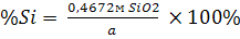 К навеске 0,2г анализируемого вещества прибавили 2,5 г иодата калия и 20 мл серной кислоты. Анализируемую смесь упарили досуха. После охлаждения прибавляли 50 мл соляной кислоты (3:2) и 350 мл воды, доводили до кипения. Отфильтровывали осадок и прокаливали до постоянного веса при T = 1000ºC. Процент кремния прасчитывали по следующей формуле: