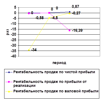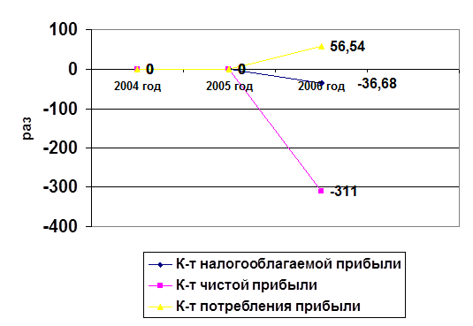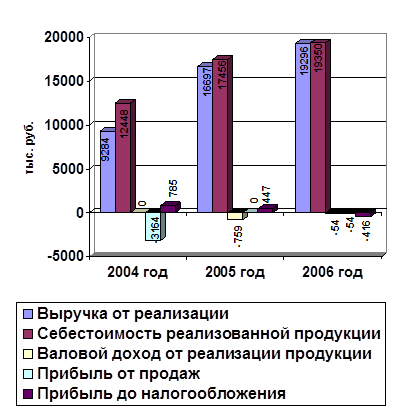 В процессе формирования прибыли у фирмы наблюдается рост таких показателей как выручка от реализации и себестоимость продукции: за анализируемый период значение этих показателей было в 2004 году – 9284 тыс. руб. выручка от реализации и 12448 ты. руб. себестоимость реализованной продукции; в 2005 году – 16697 тыс. руб. и 17456 тыс. руб.; в 2006 году – 19296 тыс. руб. и 19350 тыс. руб. соответственно. Валовой доход от реализации продукции хотя имел значительный рост, однако также имел убыточное значение (в 2005 году убыток составил 759 тыс. руб., в 2006 году – 54 тыс. руб.). Прибыль от продаж у фирмы имеет отрицательное значение. Чистая прибыль отсутствует.