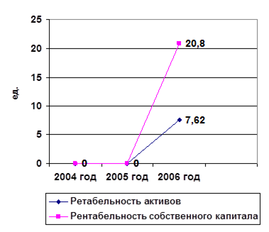 В 2006 году происходит рост коэффициента рентабельности активов с 0 в 2004 году до 7,62 в 2006 году. Коэффициент рентабельности активов показывает, что в 2006 году предприятие получает прибыль 7,62 с каждого рубля. Также происходит рост рентабельности собственного капитала с 0 до 20,8, что является положительным признаком и говорит о том, что фирма начинает более эффективно использовать капитал, вложенный в финансово-хозяйственную деятельность на длительный срок.