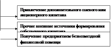В составе внешних источников формирования собственного капитала основное место принадлежит привлечению предприятием дополнительного паевого (путем дополнительных взносов средств в уставный фонд) или акционерного (путем дополнительной эмиссии и реализации акций) капитала. Для отдельных предприятий одним из внешних источников формирования собственных финансовых ресурсов может являться предоставляемая им безвозмездная финансовая помощь (как правило, такая помощь оказывается лишь отдельным государственным предприятиям различного уровня). В число прочих внешних источников входят бесплатно передаваемые предприятию материальные и нематериальные активы, включаемые в состав его баланса.