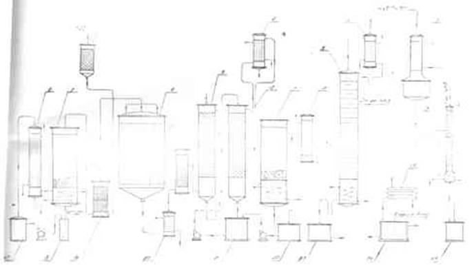 Для уменьшения выхода ацетальдегида, поступающие ацетилен и хлористый водород подвергаются осушке. Ацетилен поступает в систему через гидрозатвор 18 и ротационным компрессором через водоотделитель 17 подается в холодильник 6, охлаждаемый рассолом с температурой 0°С. Сконденсировавшаяся влага отбирается внизу холодильника; ацетилен проходит в осушитель ацетилена 7, заполненный кусками твердого едкого кали. Образующаяся 45%-ная водная щелочь с примесью поташа спускается внизу сборника, систематически подогреваясь для предотвращения кристаллизации. Осушенный ацетилен поступает в смеситель газов 19. Туда же направляется через ловушку 1 хлористый водород.