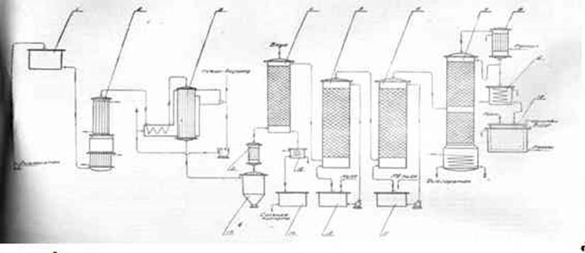 Винилацетат-сырец из напорного бака поступает в ректификационную колонну 2. При температуре верха колонны 21°С отгоняются в основном легколетучие продукты; после конденсации в дефлегматоре 3 часть конденсата направляется в колонну в виде флегмы, часть ого охлаждается в холодильнике 4 и собирается в сборнике 20.