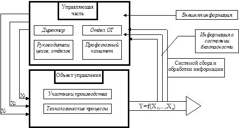Состояние объектов управления определяется входными параметрами — факторами, воздействующими на безопасность трудовой деятельности (X1 ,...,Xn ). К ним можно отнести безопасность конструкций, безопасность технологических процессов, гигиенические параметры производственной среды и социально-психологические факторы. Так как реальные производственные условия не являются абсолютно безопасными, то выходной характеристикой системы служит некоторый уровень безопасности (Y=f(X1 ,...,Xn )). Выходы объектов управления связаны через систему сбора и обработки информации со входами управляющей части. Информация о выявленных в процессе контроля отклонениях от нормальной безопасности труда, потенциально опасных факторах, поступает в управляющий орган для анализа и принятия решений, направленных на регулирование управляющих параметров входов объекта управления. Таким образом СУБТ действуют по принципу обратной связи и при этом осуществляется замкнутое автономное управление. СУБТ — элемент системы управления более высокого порядка (министерство народного хозяйства). Поэтому на входе управляющей системы поступает внешняя информация: законодательная, директивная, нормативная.
