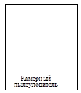В камерных пылеуловителях загрязненный воздух поступает через входной трубопровод 1 в рабочую камеру 3, где он отделяется от пыли, которая оседает под действием силы тяжести и выходит через трубопровод 2. Используется для грубой и средней очистки.