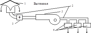Ветер, обдувая слово 2, создает на ее поверхности разряжение, вследствие чего воздух движется из помещения по трубопроводу 5 и выходит наружу через кольцевые щели, образованные между обечайкой 2, краями колпака 3 и корпусом диффузора.