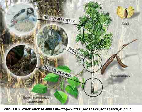Экосистему березовой рощи также населяют и некоторые виды живых организмов (животных и микроорганизмов) [рис. 6]. Из птиц можно назвать пестрого дятла [рис. 7], большую синицу [рис. 8] и др.; из насекомых – шмеля, осу, майского жука, комара; из др. мелких организмов – дождевого червя [рис. 9], жужелицу, майского хруща, пестрого усача, черного щелкуна, погребального могильщика. Интересно также, что разные жизненные формы занимают разные экологические ниши. На рис. 10, например, представлены экологические ниши птиц в березовой роще.