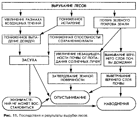 Основным последствием деятельности человека является обезлесенье, которое влечет за собой тяжелые последствия [рис. 11]. Среди лиственных пород многие после вырубки дают поросль — это побеги из спящих почек, расположенных на стволе у основания дерева или на корнях. Порослевые побеги используют мощную корневую систему взрослого дерева и запасы питательных веществ, отложенных в ней, и быстро растут. У них крупные, иногда гигантские листья.