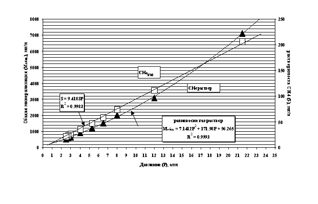 Рис. 2. Растворимость (S) метана (квадраты) и равновесие в системе метан-вода (треугольники) в зависимости от общей минерализации (M) порового раствора и общего давления.