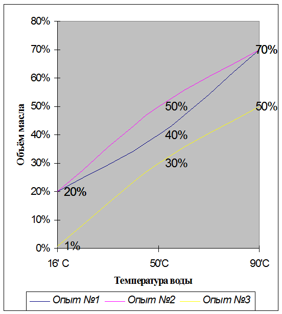 Данную смесь перемешали и залили 1 литром водопроводной воды (t1= 16°C). При такой температуре на поверхность воды всплыло около 20% (1/5 часть) масла от общего объёма. Затем, мы при постоянном перемешивании подняли температуру воды до t2= 50°C и при которой на поверхности количество масла увеличилось и составляло около 40% от общего объема. Увеличение температуры воды до t3= 90°C также повлекло за собой утолщение нефтяной пленки, которая составила примерно 70% масла.