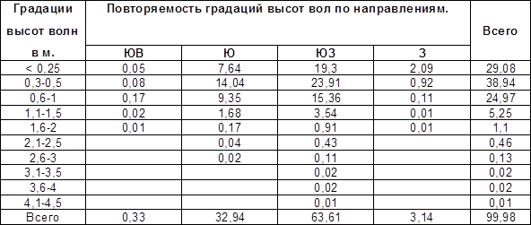 Измерение элементов волн происходило на глубине около пяти метров. Повторяемость градаций высот волн за период 1991 – 1999 гг. приведена в таблице №1.3.