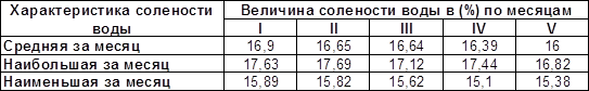 Как видно из таблицы № 1.4. средняя величина солености меняется от 16% в мае месяце до 16,92% в ноябре, средняя величина солености за год равна 16,63%. Наибольшая за месяц равна 18,03% в августе месяце, наименьшая 14,89% в июле месяце.