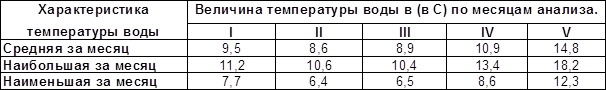 Анализ данных показал, что в течении года средняя температура воды составляет 16 градусов Цельсия. Средняя за месяц величина за месяц температуры воды изменяется от 8,6 градусов Цельсия в феврале до 24,8 градуса Цельсия в августе месяце. Наибольшая температура наблюдалась в августе месяце 26,9 градуса Цельсия, наименьшая в феврале 6,4 градуса Цельсия.