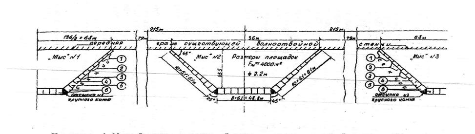 Рекомендуемый вариант искусственных мысов имеет в плане форму трапеции. Тыльной (береговой) гранью длиной 125-135 м они примыкают к береговому уступу или имеющемуся продольному берегоукрепительному сооружению. Морская (передняя) грань длиной 45-50 м удалена от берегового уступа или берегоукрепительного сооружения на 40 — 45 м. Боковые грани мыса имеют длину 55-60 м и примыкают к береговой грани под углом 45°.