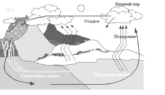 Круговорот воды является одним из грандиозных процессов на поверхности земного шара. Он играет главную роль в связывании геологического и биотического круговоротов. В биосфере вода, непрерывно переходя из одного состояния в другое, совершает малый и большой круговороты. Испарение воды с поверхности океана, конденсация водяного пара в атмосфере и выпадение осадков на поверхность океана образуют малый круговорот. Если же водяной пар переносится воздушными течениями на сушу, круговорот становится значительно сложнее. В этом случае часть осадков испаряется и поступает обратно в атмосферу, другая — питает реки и водоемы, но в итоге вновь возвращается в океан речным и подземным стоком, завершая тем самым большой круговорот. Важное свойство круговорота воды заключается в том, что он, взаимодействуя с литосферой, атмосферой и живым веществом, связывает воедино все части гидросферы: океан, реки, почвенную влагу, подземные воды и атмосферную влагу. Вода — важнейший компонент всего живого. Грунтовые воды, проникая сквозь ткани растения в процессе транспирации, привносят минеральные соли, необходимые для жизнедеятельности самих растений.