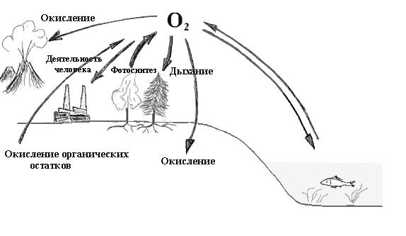 Круговорот кислорода. Кислород — наиболее активный газ. В пределах биосферы происходит быстрый обмен кислорода среды с живыми организмами или их остатками после гибели.