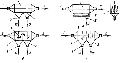 а — полая: б — с горизонтальными полками; в, г — с вертикальными перегородками: / — запыленный газ; // — очищенный газ; /// — пыль; 1 — корпус; 2 — бункер; 3 — штуцер для удаления;