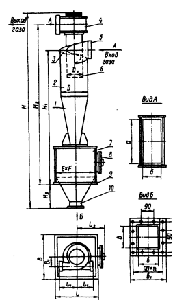 1 - коническая часть циклона; 2 — цилиндрическая часть циклона; 3 — винтообразная крышка; 4 — камера очищенного газа; 5 — патрубок входа запыленного газа; 6 — выхлопная труба; 7 -бункер; 8 — люк; 9 — опорный пояс; 10 — пылевыпускное отверстие.