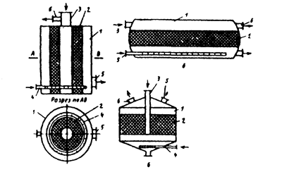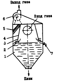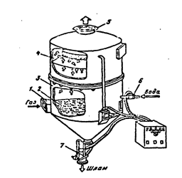 1 - входной патрубок; 2 — газораспределительная решетка; 3 — корпус; 4 -каплеотделитель; 5 — выходной патрубок; 6 — регулятор подачи воды; 7 — разгрузочное устройство.