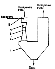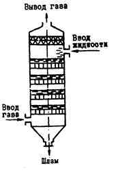 Мокрую очистку газов с частицами 2-3 мкм можно проводить в скрубберах центробежного типа СЦВП, в которых жидкость дробится непосредственно запыленным газом. Шлам, оседающий в нижней части скруббера, выводится эрлифтом в контейнер, а осветленная жидкость вновь возвращается в скруббер. Производительность таких аппаратов 5000-20000 м /ч, допустимая запыленность 2 г/м3, температура газов 80 «С, гидравлическое сопротивление 2,4 кПа, расход воды на очистку 0,05 м3/м3 .