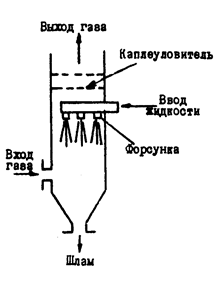 В распиливающих абсорберах межфазная поверхность образуется мелкими каплями путем дробления, распыления жидкости. В объеме аппарата с помощью форсунок создаются капли, контактирующие с газовым потоком.